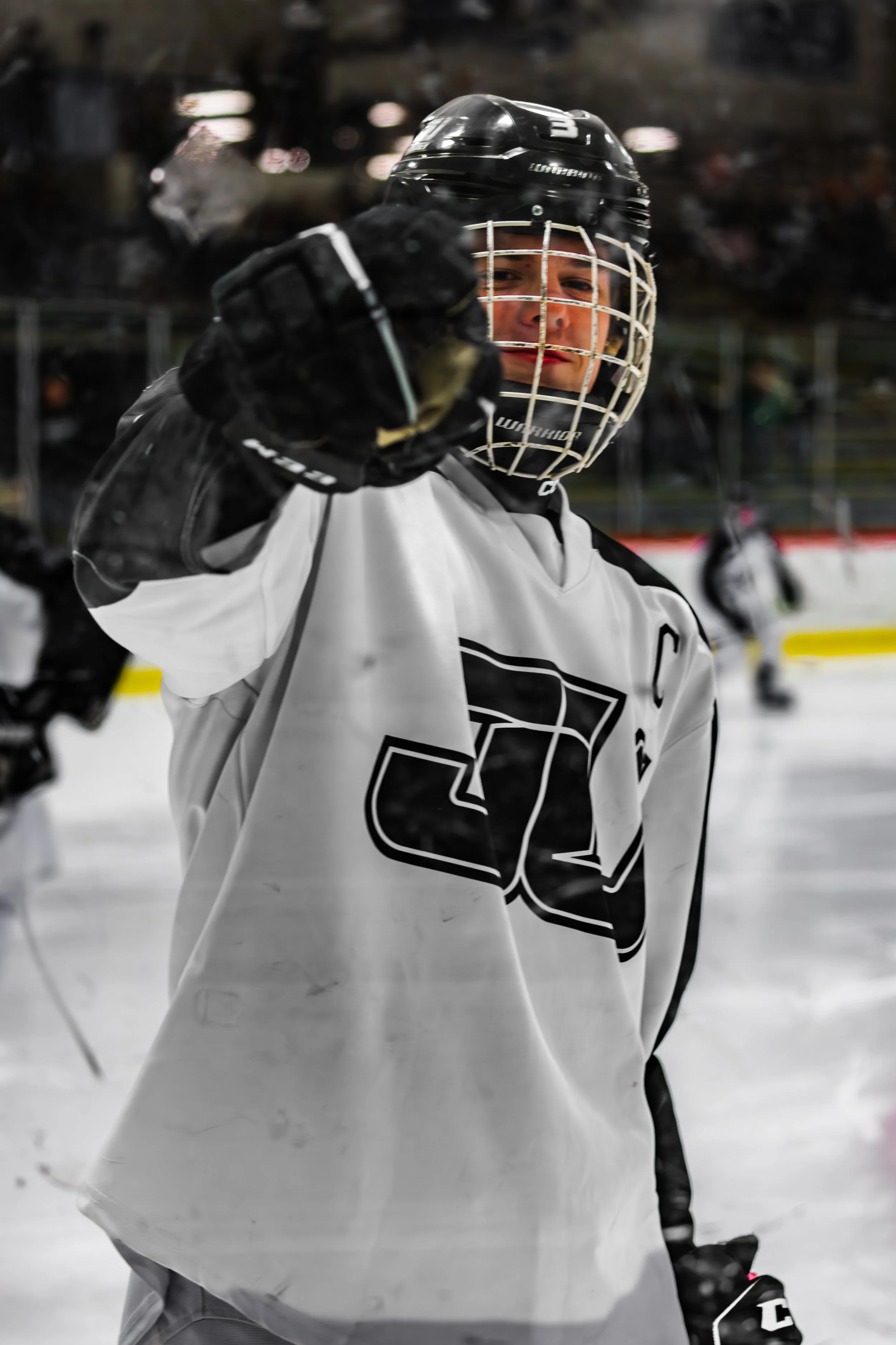 An ice hockey player in a white jersey and black helmet pointing towards the camera on the ice rink.