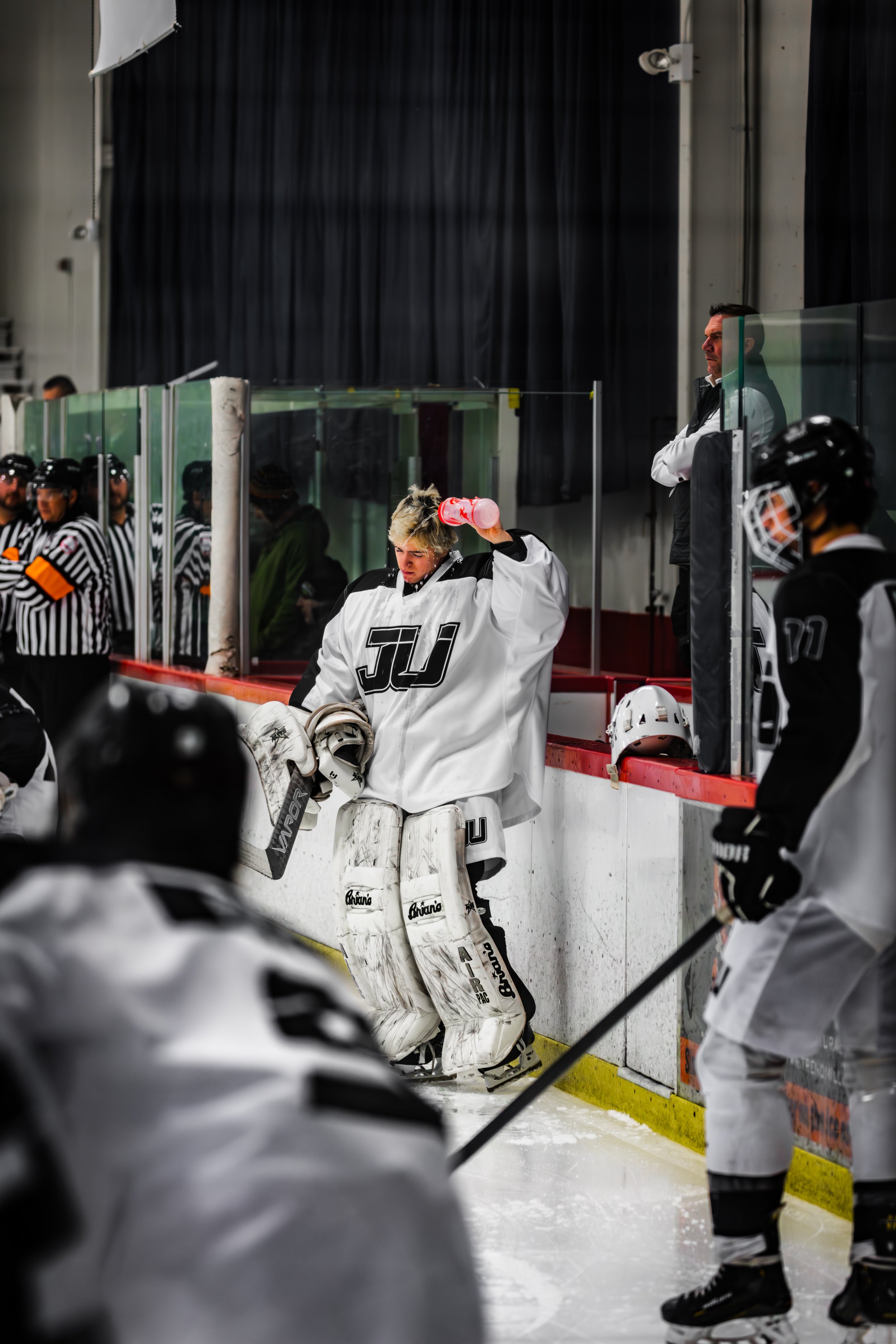 Hockey goalie in white uniform and helmet, sitting on the bench during a game.