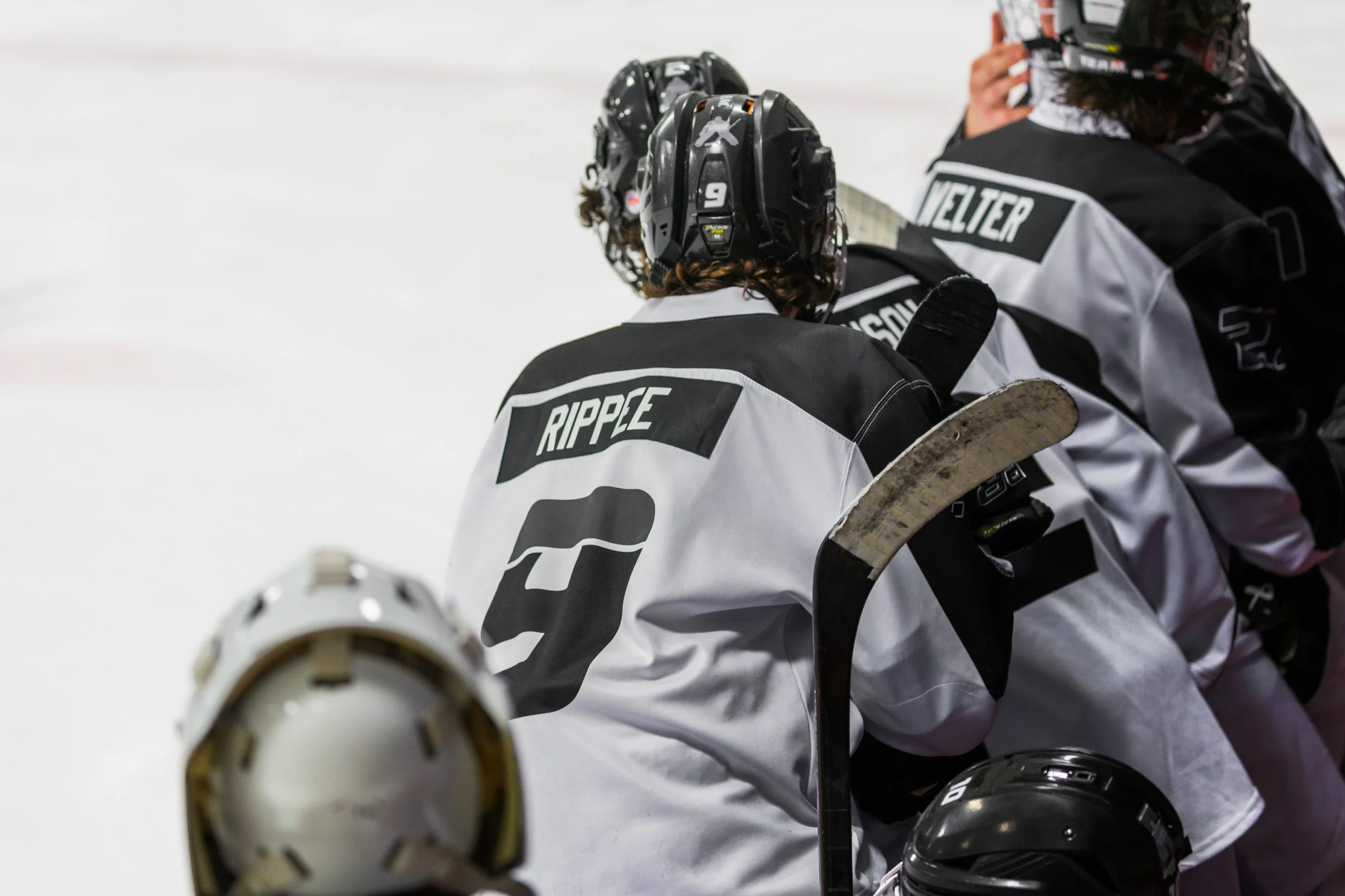 Ice hockey team wearing black and white jerseys gathered on the ice rink, with spectators watching from the stands in the background.